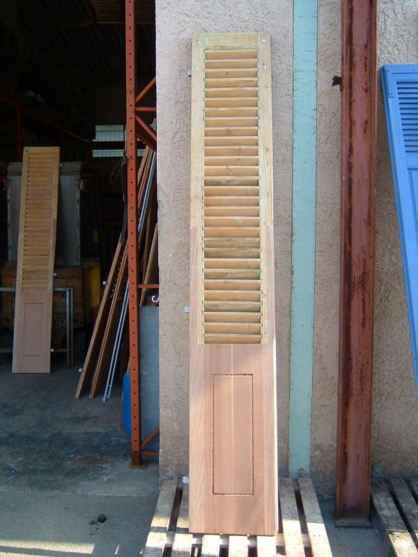 Nous avons tout d'abord démonté les anciennes réparations qui avaient été mal faites, puis nous avons décapé entièrement ce volet persienne, nous avons ponçé la partie saine, et avons remplacé les partie abimées par du bois exotique.